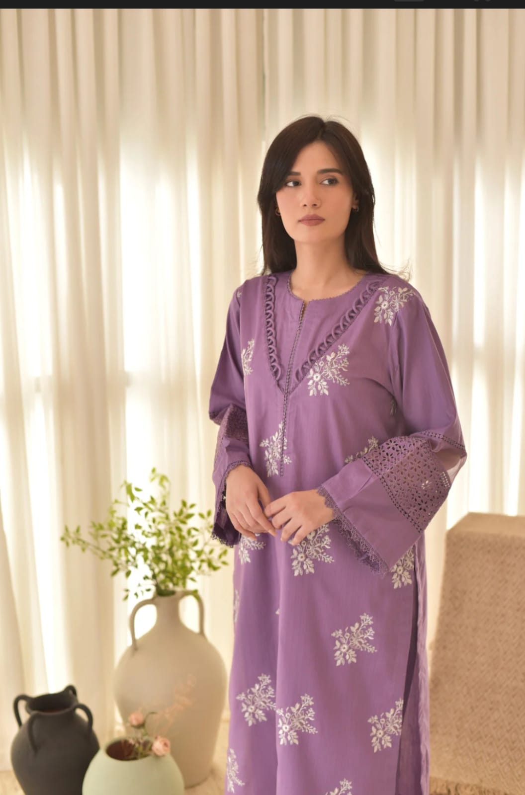 3pc Fully embroidered shirt with lace/loop detail on the neckline